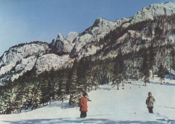 Dolina Kościeliska w zimowej scenerii. Widok z Hali Pisanej na Organy. Turyści na pierwszym planie.