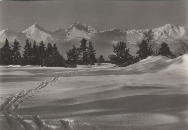 Widok na boczn± grań Tatr Wysokich z południa w scenerii zimowej. Od lewej: Tępa, Kończysta, Batyżowiecki Szczyt, Gerlach, Starole¶na i Sławkowski Szczyt.
