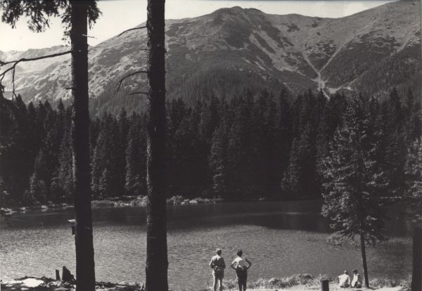 Widok na Smreczyński Staw. Przy brzegu turyści.