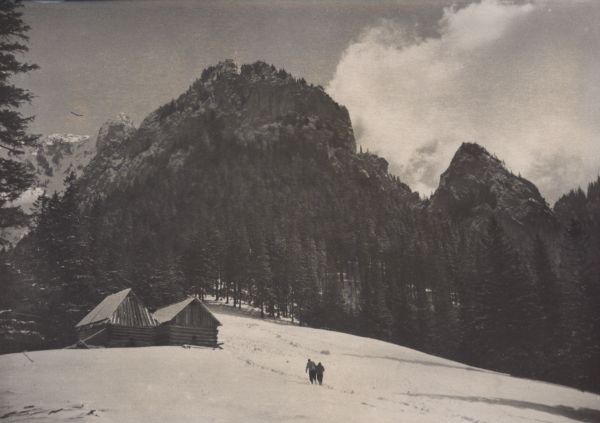 Szałasy na Polanie Pisanej w zimowej scenerii. W tle Saturn i Ratusz.