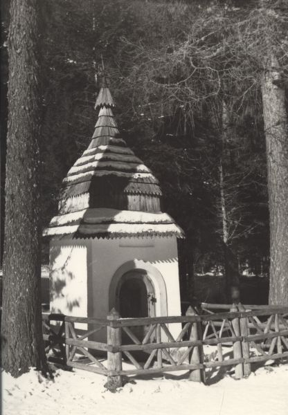 Zabytkowa kapliczka zbójnicka w Dolinie Kościeliskiej w zimie.