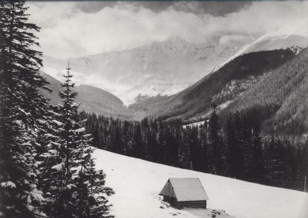 Hala Smytnia w Dolinie Kościeliskiej w zimowej scenerii. Na Hali widoczny szałas pasterski. W tle Błyszcz.