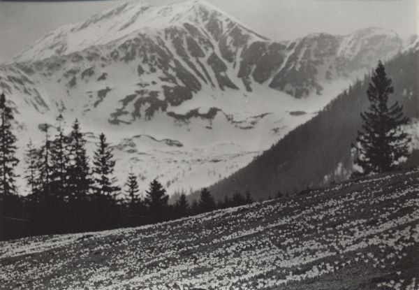 Hala Smytnia w Dolinie Kościeliskiej. Na pierwszym planie kwitnące krokusy (Crocus scepusiensis). W tle zaśnieżona Bystra i Błyszcz.