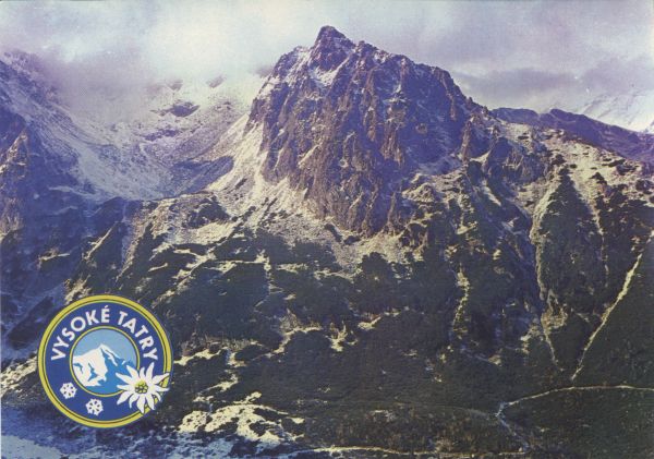 Widok z Rakuskiej Czuby na Zielony Staw Kieżmarski, Dolinę Jagnięc±, Rzeżuchowe Turnie i Kozi Szczyt. Na dole po lewej stronie logo miasta: VYSOKÉ TATRY.