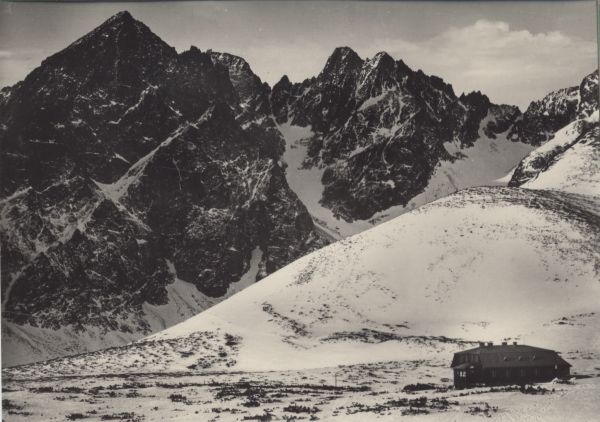Schronisko Kieżmarskie wczesną wiosną. W tle Mały Kieżmarski Szczyt, Łomnica i Durny Szczyt.