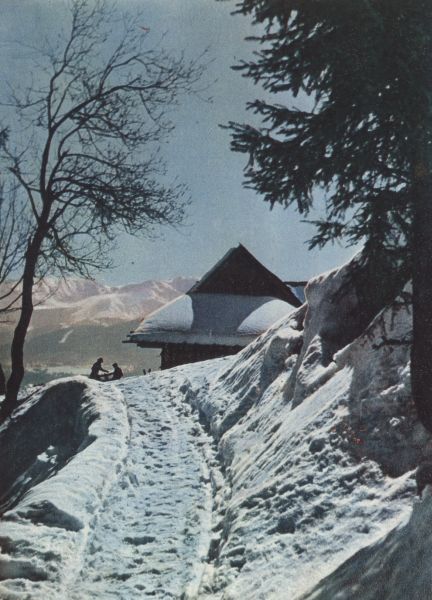 Zimowy widok na drogę prowadzącą do domostwa na Gubałówce. Widoczne 2 osoby przy domu. W tle Tatry Wysokie.