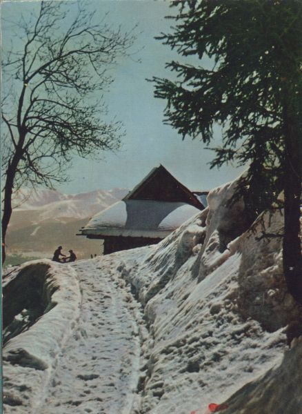 Zimowy widok na drogę prowadzącą do domostwa na Gubałówce. Widoczne 2 osoby przy domu. W tle Tatry Wysokie.