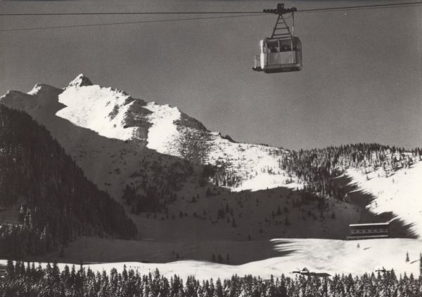 Wagonik kolei linowej na Kasprowy Wierch w zimowej scenerii. Widoczne schronisko na Kalatówkach.