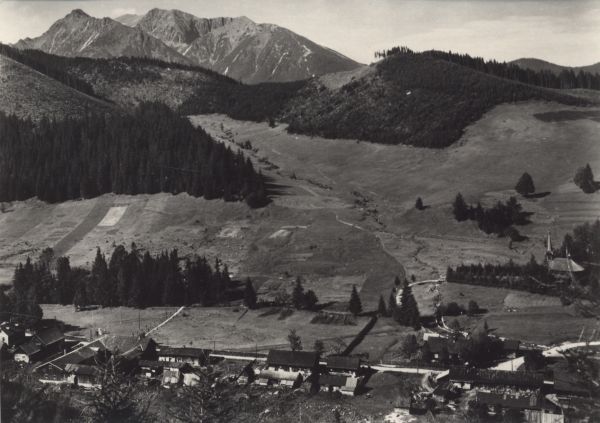 Jaworzyna. Zabudowania osady, w tle szczyty Tatr Wysokich.