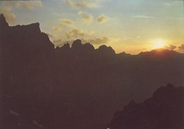 ČSSR - VYSOKÉ TATRY - HIGH TATRAS Javorová dolina. Západ slnka nad hrebeňom Javorových veží.
