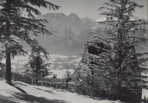 Widok z Gubałówki na Giewont w zimowej scenerii. Na pierwszym planie dom góralski.