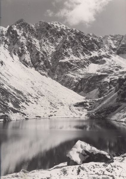 Widok na Czarny Staw Gąsienicowy w zimowej scenerii. W tle Granaty.