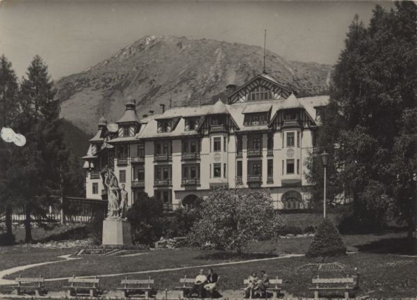 Budynek Grand Hotelu w Starym Smokowcu. Przed hotelem park i pomnik upamiętniający bohaterów II wojny światowej. W tle Sławkowski Szczyt.