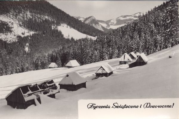 Widok na szałasy pasterskie na Hali pod Kominami, w dali Przysłop Miętusi. Napis: Życzenia Świąteczne i Noworoczne.