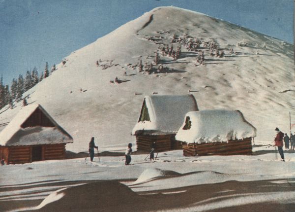 Polana Kopieniec w zimowej scenerii i narciarze stojących przy szałasach.