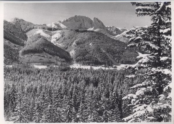 Widok na Giewont w scenerii zimowej. Na pierwszym planie ośnieżony las.