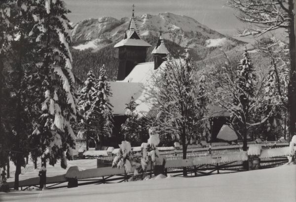Widok na drewniany kościółek w stylu podhalańskim w otoczeniu drzew w zimie. W tle masyw Kominiarskiego Wierchu.