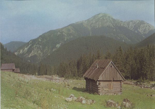 Widok na Kominiarski Wierch z Polany Chochołowskiej. Na polanie szałasy pasterskie.