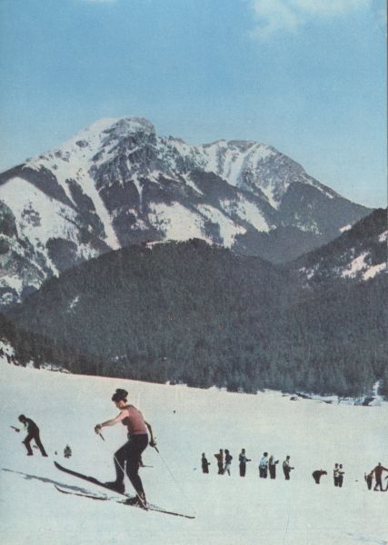 Widok na Kominiarski Wierch zimą. Na Polanie Chochołowskiej widoczni narciarze.