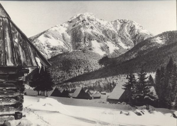 Widok z Polany Chochołowskiej na Kominiarski Wierch w zimowej scenerii. Na polanie widoczne szałasy.