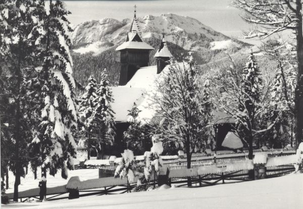 Widok na drewniany kościółek w stylu podhalańskim w otoczeniu drzew w zimie. W tle Kominiarski Wierch.