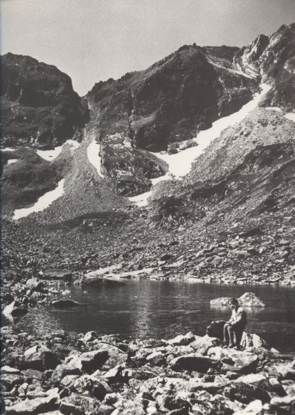 Dolina za Mnichem - Stawek Staszica. Na pierwszym planie głaz i siedzący na nim chłopak.