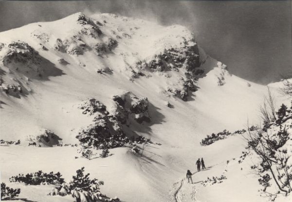 Zielony Wierch Rohacki od Niżniego Stawu Rohackiego w zimowej scenerii. Widoczni turyści idący w górę.
