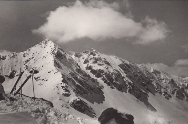 Widok na Liliowe zimą. Z lewej strony widoczne narty wbite w śnieg.