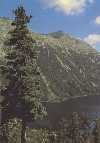 Limba (Pinus cembra L.) nad Morskim Okiem w Dolinie Rybiego Potoku. W tle Opalony Wierch.