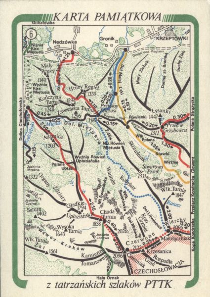 Karta pamiątkowa z tatrzańskich szlaków PTTK - szkic mapy okolic Doliny Miętusiej.