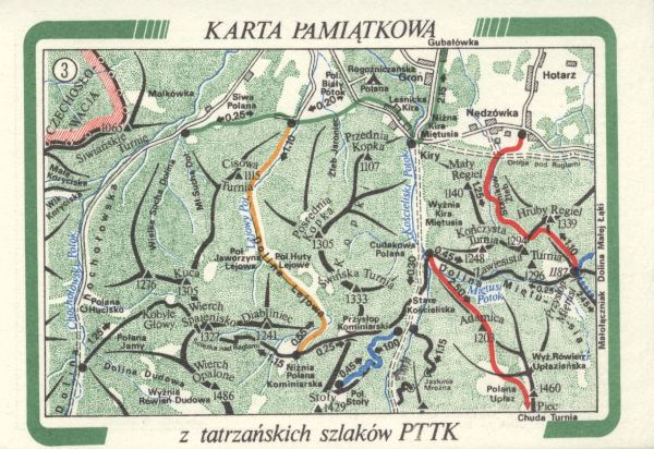 Karta pamiątkowa z tatrzańskich szlaków PTTK - szkic mapy okolic Doliny Lejowej.