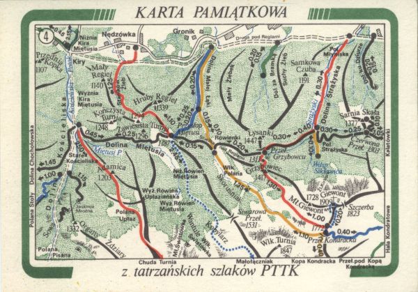 Karta pamiątkowa z tatrzańskich szlaków PTTK - szkic mapy okolic Doliny Małej Łąki.