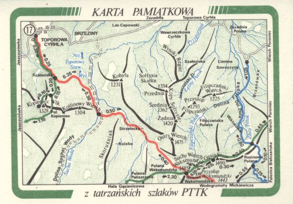 Karta pamiątkowa z tatrzańskich szlaków PTTK - szkic mapy okolic Kopieńca Wielkiego i Gęsiej Szyi.