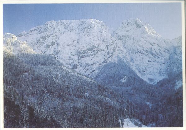 Widok na zimowy Giewont od północy. W dole Dolina Strążyska.