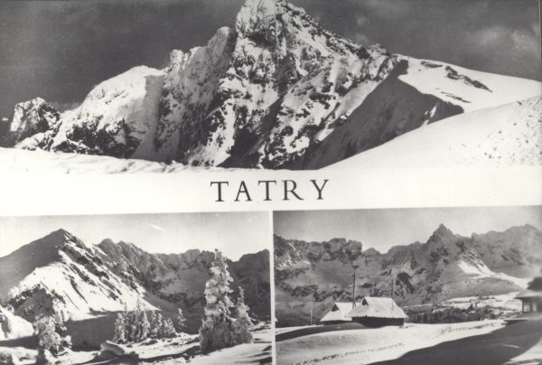 Pocztówka 3 elementowa: Świnica. Żółta Turnia i Granaty. Panorama Tatr Wysokich z Hali Gąsienicowej, pośrodku Kościelec. Pomiędzy zdjęciami napis: TATRY.