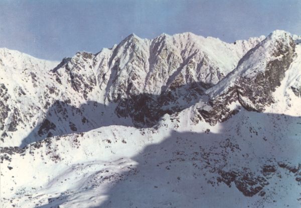 Granaty w zimowej scenerii. Z prawej Kościelec, w dole Karb.