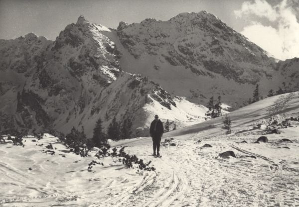 Widok na Kościelec i Świnicę zimą z Hali Gąsienicowej. Na pierwszym planie narciarz.