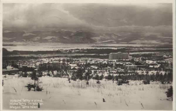 Widok na zabudowania Nowego i Starego Smokowca w zimowej scenerii. W lewym dolnym rogu napis VYSOKÉ TATRY V ZIMĚ, również w języku niemieckim i węgierskim.