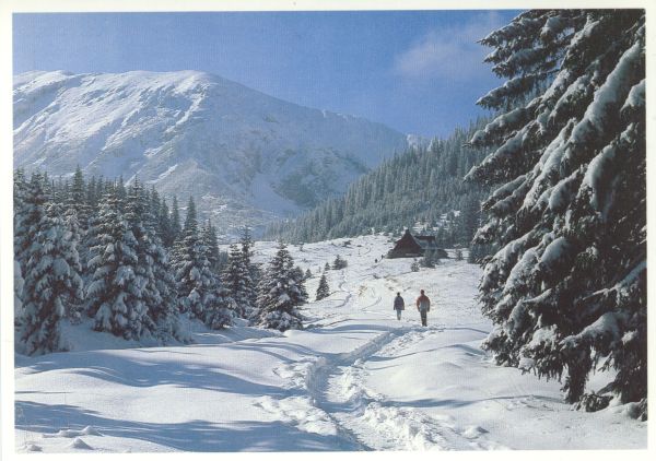 Hala Kondratowa zimą. Pośrodku schronisko i idących dwoje turystów. W tle Kopa Kondracka.