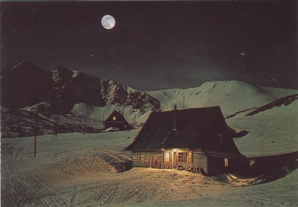 Hala G±sienicowa w zimow± noc. Na pierwszym planie Betlejemka, z tyłu stacja meteorologiczna PAN. W tle ¦winica. Na niebie księżyc w pełni.