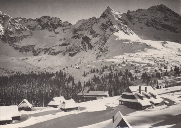 Schronisko Murowaniec i stacja meteorologiczna na Hali Gąsienicowej w zimie. W tle Orla Perć z Kozim Wierchem i Świnicą oraz Kościelec.
