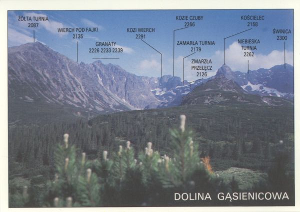 Dolina G±sienicowa. W tle Żółta Turnia, Granaty, Kozi Wierch, Ko¶cielec i ¦winica. Na dole po prawej stronie napis: Dolina G±sienicowa. Nadrukowane nazwy szczytów i ich wysoko¶ć.