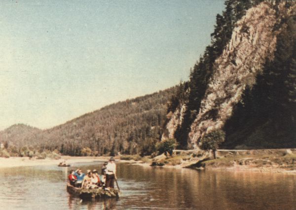 Spływ Dunajcem. Na rzece tratwa z turystami.
