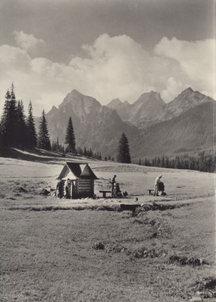 Widok z Polany Biała Woda na Młynarz, Wysok±, Niżne Rysy i Niżni Żabi Szczyt. Na polanie tury¶ci przy Œródełku.