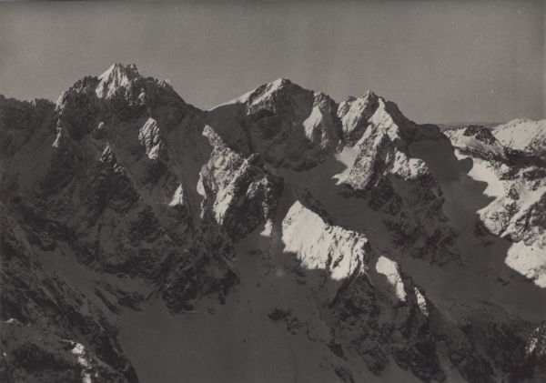 Tatry Wysokie. Widok z Rohatki. Z lewej Rumanowy Szczyt i Ganek. Za nimi Wysoka, Przełęcz Waga, Rysy i Niżnie Rysy.