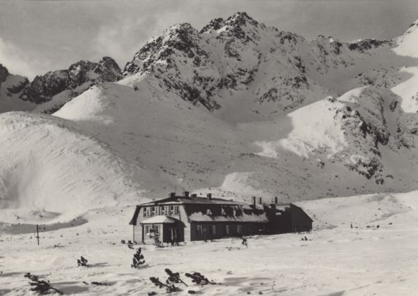 Tatry Wysokie. Schronisko Kieżmarskie w Dolinie Białych Stawów. Z lewej w tle Baranie Rogi, w środku Kozi Szczyt.