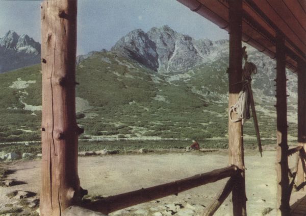 Widok ze schroniska Kieżmarskiego nad Wielkim Białym Stawem na Kozi Szczyt, z lewej Durny Szczyt. Przed budynkiem siedzi turysta.