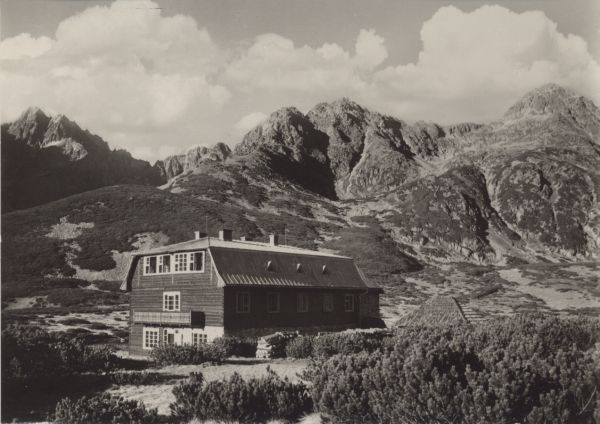Tatry Wysokie - Schronisko Kieżmarskie (państwowe centrum wychowania fizycznego). W tle Durny Szczyt, Kozi Szczyt i Jagnięcy Szczyt.