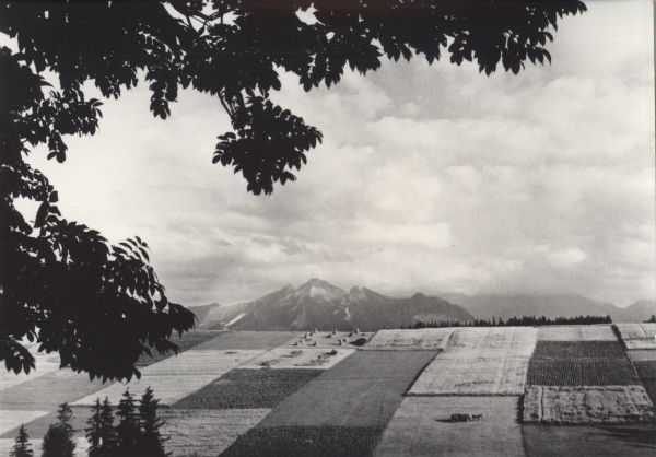 Panorama Tatr Bielskich z Bukowiny Tatrzańskiej. Na pierwszym planie pola uprawne.