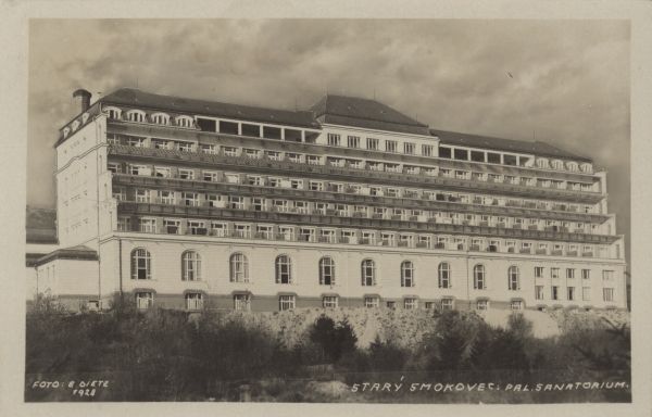Budynek sanatorium w Starym Smokowcu. Na dole wpisany tytuł i nazwisko fotografa.
